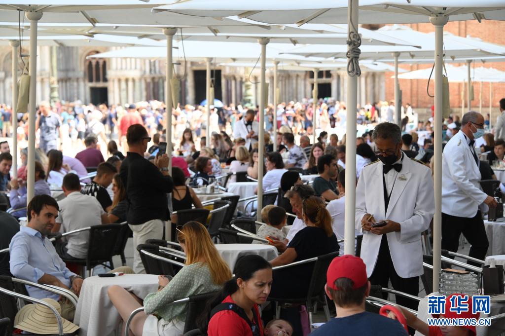 8月3日,游客在意大利威尼斯一處餐廳的戶外就餐區消費。