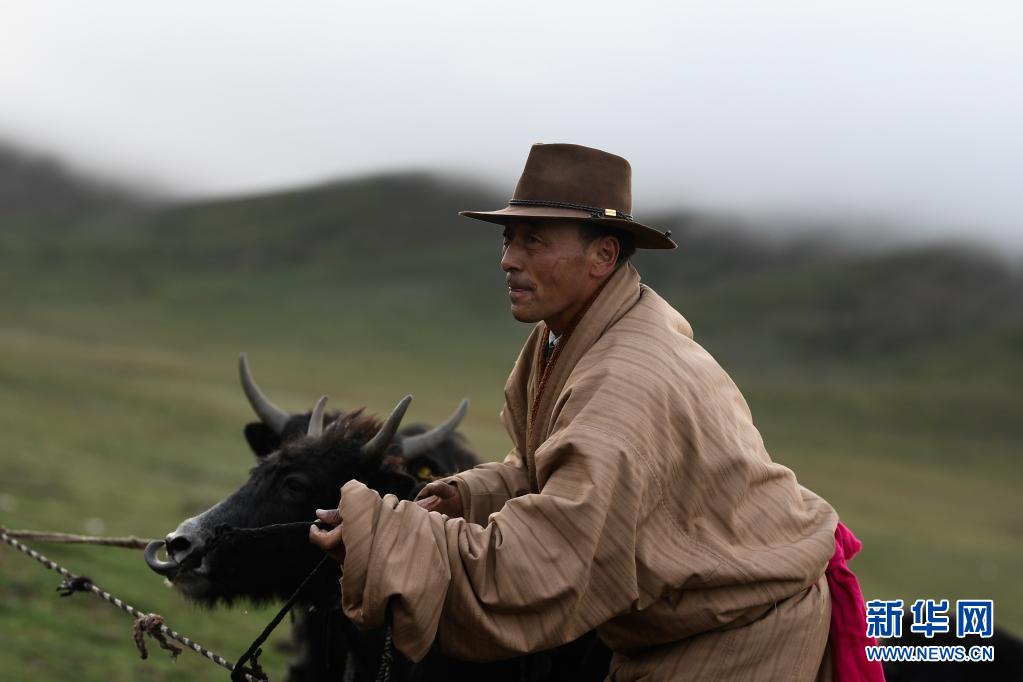 8月3日,在瑪沁縣當洛鄉貢龍村的夏季草場上,牧民在拴牦牛。