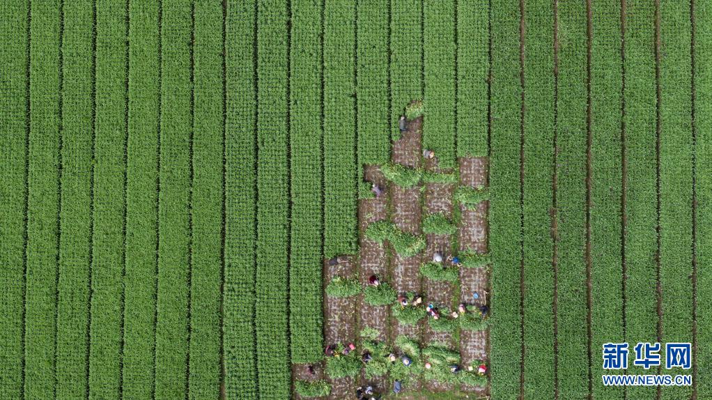 8月13日,在四川省阿壩藏族羌族自治州紅原縣刷經寺鎮加當村,當地群眾在收割高原萵筍(無人機照片)。