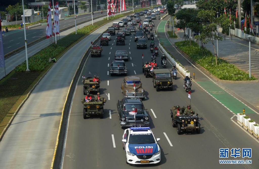 8月17日,參加印度尼西亞獨立日慶祝的車輛行駛在雅加達街頭。8月17日是印度尼西亞獨立日。新華社發(祖卡南攝)