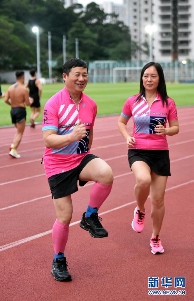 猛龍長跑隊創(chuàng)辦人莫儉榮(左)與領跑員嚴惠茵訓練前進行熱身(7月29日攝)。