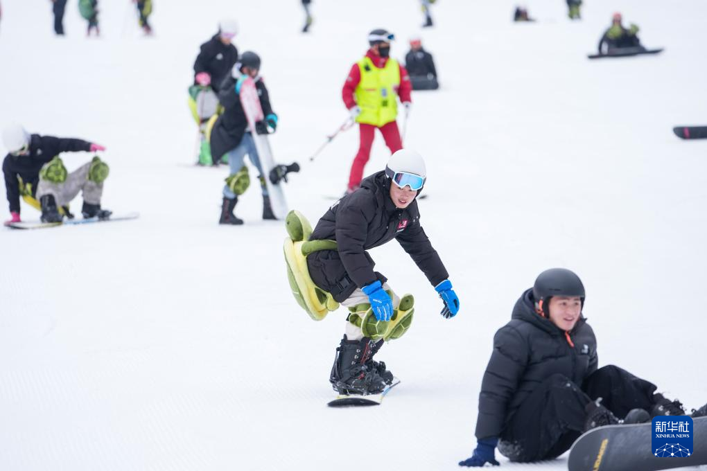 12月8日,游客在阿坝州汶川县羌人谷滑雪场滑雪。