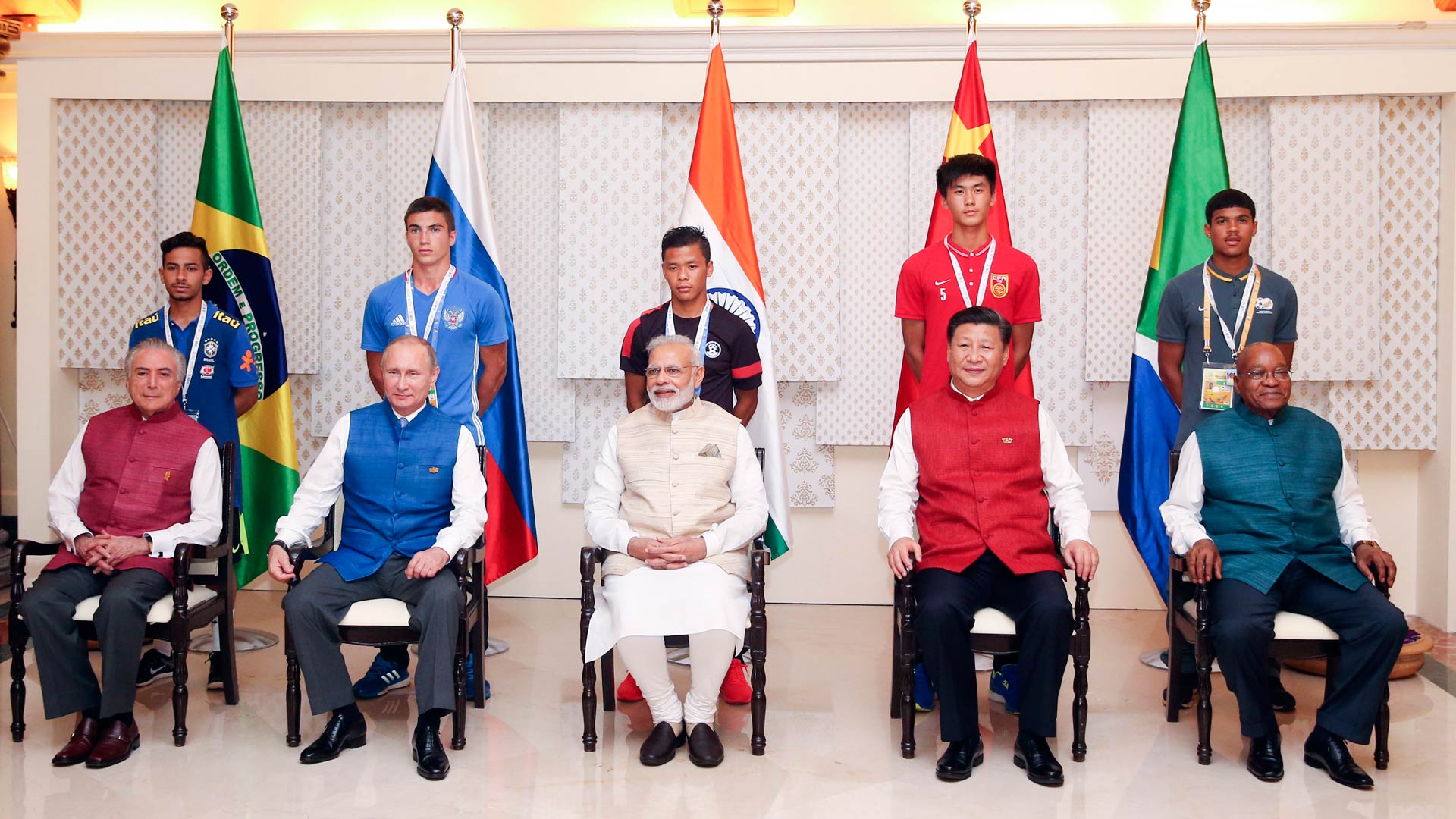 10月15日,國家主席習(xí)近平與印度總理莫迪、南非總統(tǒng)祖馬、巴西總統(tǒng)特梅爾、俄羅斯總統(tǒng)普京在印度果阿同參加金磚國家17歲以下少年足球賽的各國代表隊隊長合影。新華社記者 姚大偉 攝