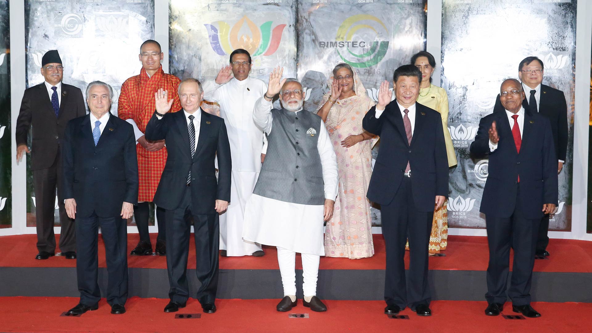 10月16日,金磚國家領(lǐng)導(dǎo)人同“環(huán)孟加拉灣多領(lǐng)域經(jīng)濟技術(shù)合作倡議”成員國領(lǐng)導(dǎo)人對話會在印度果阿舉行。國家主席習(xí)近平同印度總理莫迪、南非總統(tǒng)祖馬、巴西總統(tǒng)特梅爾、俄羅斯總統(tǒng)普京以及斯里蘭卡總統(tǒng)西里塞納、孟加拉國總理哈西娜、不丹首相托杰、尼泊爾總理普拉昌達(dá)、緬甸國務(wù)資政昂山素季、泰國政府代表等共同出席。這是與會領(lǐng)導(dǎo)人合影。新華社記者 姚大偉 攝