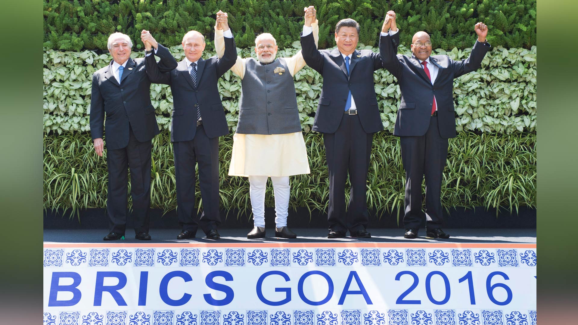 10月16日,金磚國家領(lǐng)導(dǎo)人第八次會晤在印度果阿舉行。中國國家主席習(xí)近平、印度總理莫迪、南非總統(tǒng)祖馬、巴西總統(tǒng)特梅爾、俄羅斯總統(tǒng)普京出席。這是5國領(lǐng)導(dǎo)人合影。新華社記者 謝環(huán)馳 攝