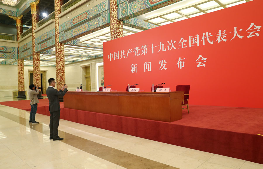 2017年10月17日下午,中國(guó)共產(chǎn)黨第十九次全國(guó)代表大會(huì)新聞發(fā)言人在人民大會(huì)堂三樓金色大廳舉行新聞發(fā)布會(huì),并回答中外記者的提問。圖為記者在現(xiàn)場(chǎng)拍攝。新華網(wǎng) 翟子赫 攝