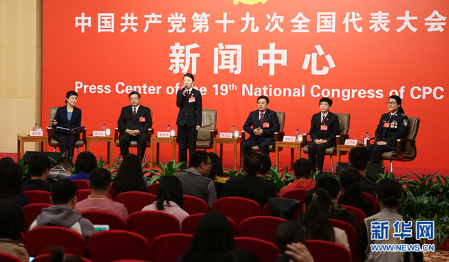 ??? 10月19日,十九大新聞中心舉辦集體采訪,邀請(qǐng)政法戰(zhàn)線代表談推進(jìn)全面依法治國(guó)。圖為采訪現(xiàn)場(chǎng)。新華網(wǎng) 郝廣鵬攝