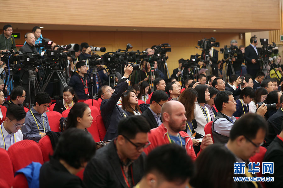 ??? 10月21日,十九大新聞中心舉辦記者招待會,邀請中共中央統(tǒng)戰(zhàn)部常務副部長張裔炯、副部長冉萬祥,中共中央對外聯(lián)絡部副部長郭業(yè)洲介紹黨的統(tǒng)一戰(zhàn)線工作和黨的對外交往情況,并回答記者提問。圖為現(xiàn)場記者。新華網(wǎng) 郝廣鵬攝
