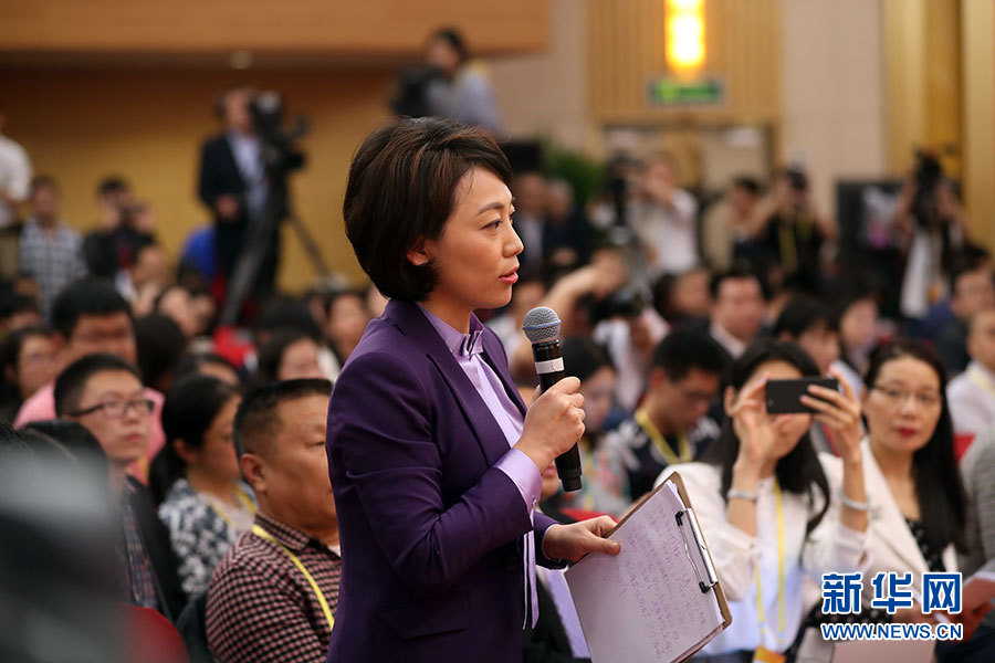 10月21日,十九大新聞中心舉辦記者招待會,邀請國家發展改革委黨組書記、主任何立峰,副主任張勇,副主任寧吉喆介紹以新發展理念為引領,推進中國經濟平穩健康可持續發展有關情況,并回答記者提問。圖為中央電視臺、中國國際電視臺記者提問。新華網 郝廣鵬攝