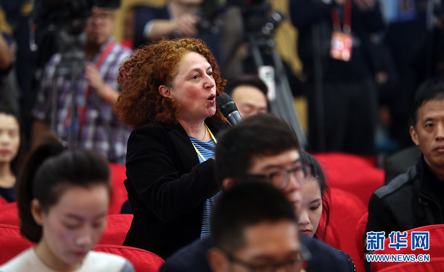 10月22日,十九大新聞中心在梅地亞中心二層新聞發(fā)布廳舉辦集體采訪活動,主題為“中國特色強(qiáng)軍之路邁出堅(jiān)定步伐”。圖為意大利24小時(shí)太陽報(bào)記者提問。新華網(wǎng) 郝廣鵬攝