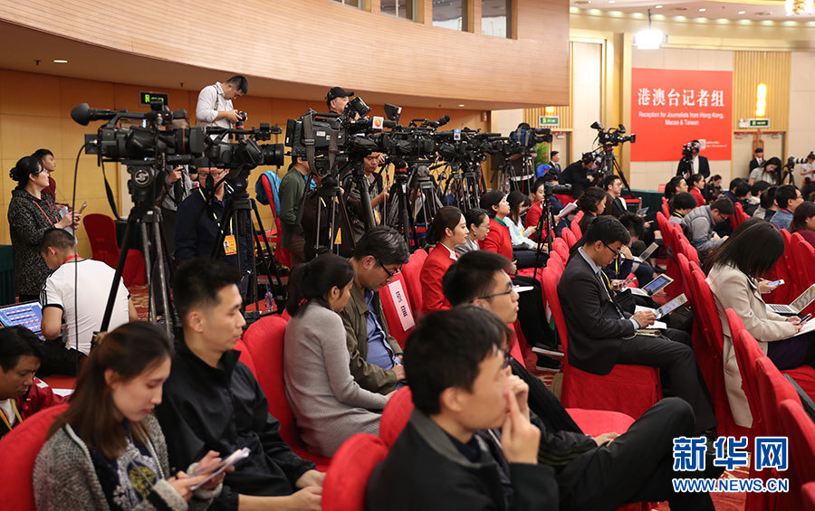 10月23日,十九大新聞中心舉辦集體采訪活動,主題為“打好生態環保攻堅戰”。圖為現場記者。新華網 郝廣鵬攝