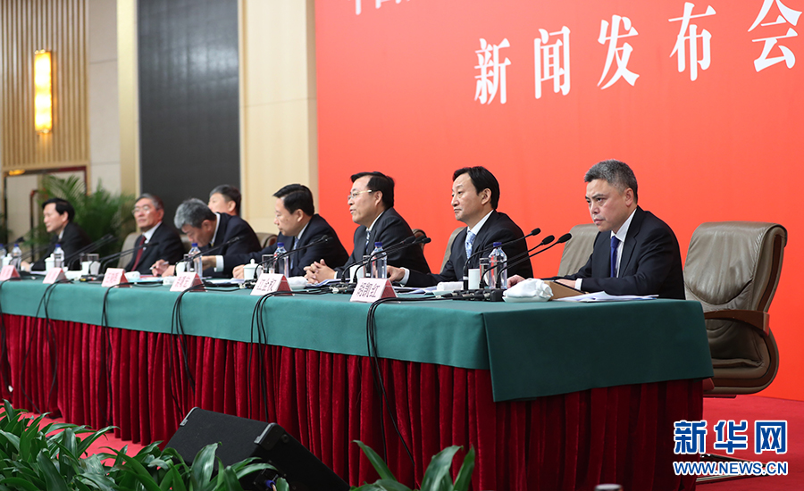 10月26日上午10:00,中國共產黨第十九次全國代表大會新聞發言人在梅地亞賓館二層新聞發布廳召開專題新聞發布會,請有關方面負責人解讀十九大報告,并回答記者關心的問題。圖為新聞發布會現場。新華網?翟子赫 攝