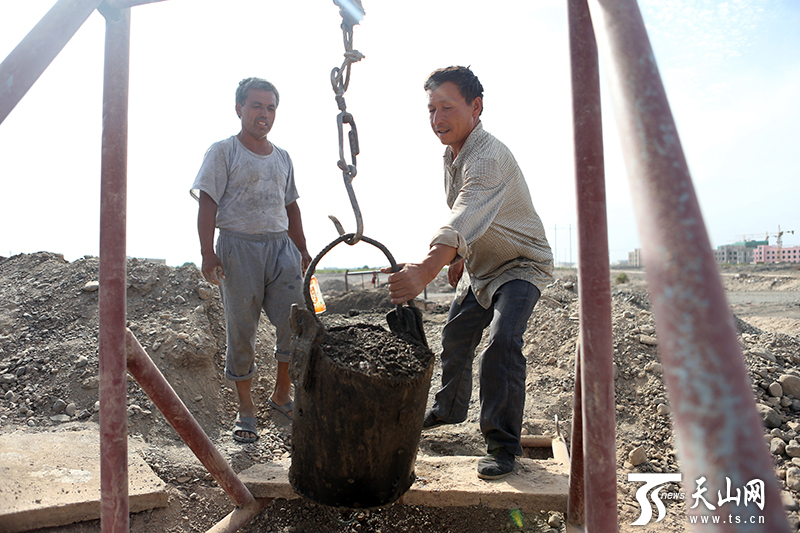 一根繩、一個(gè)桶、一輛拖拉機(jī)頭,就是庫(kù)爾班·司馬義所有的作業(yè)工具。下井時(shí),人坐在一個(gè)T形的鐵管上,用繩索固定好,一頭連著的拖拉機(jī)緩緩開(kāi)動(dòng),將繩索這頭的人吊入豎井中。大約七八分鐘后,拖拉機(jī)后退,一小桶泥沙從井里升上來(lái),庫(kù)爾班和伙計(jì)們小心地站在井口,伸手取下桶來(lái),將泥沙倒掉又掛在繩索上,如此重復(fù)。