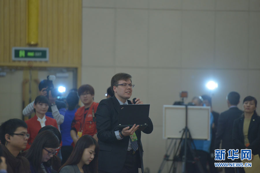 ????十二屆全國人大三次會議新聞中心于3月12日在梅地亞中心多功能廳舉行記者會,邀請中國人民銀行行長周小川,中國人民銀行副行長、國家外匯管理局局長易綱,中國人民銀行副行長潘功勝,絲路基金有限責任公司董事長金琦就金融改革與發展回答中外記者提問。圖為塔斯社記者提問。新華網/中國政府網 郭小天攝