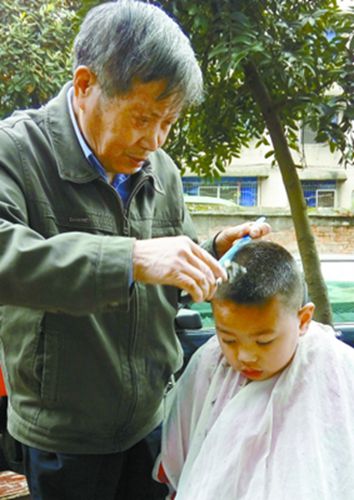 推、梳、刷、刮……很快,一個漂亮的小平頭剪好了。當(dāng)?shù)鼐用駝娂敉觐^發(fā),摸摸頭,滿意地向梁老致謝,并給老人遞上1塊錢。今年76歲的梁志高,這已經(jīng)是他義務(wù)為群眾理發(fā)的第52個春秋。