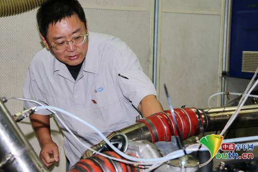鹿新弟在檢查機(jī)器設(shè)備。中國(guó)青年網(wǎng)記者張群 攝