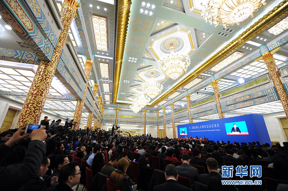3月16日上午,國(guó)務(wù)院總理李克強(qiáng)在人民大會(huì)堂三樓金色大廳會(huì)見采訪十二屆全國(guó)人大四次會(huì)議的中外記者并回答記者提出的問(wèn)題。圖為記者會(huì)進(jìn)行中。新華網(wǎng)/中國(guó)政府網(wǎng) 陳競(jìng)超 攝