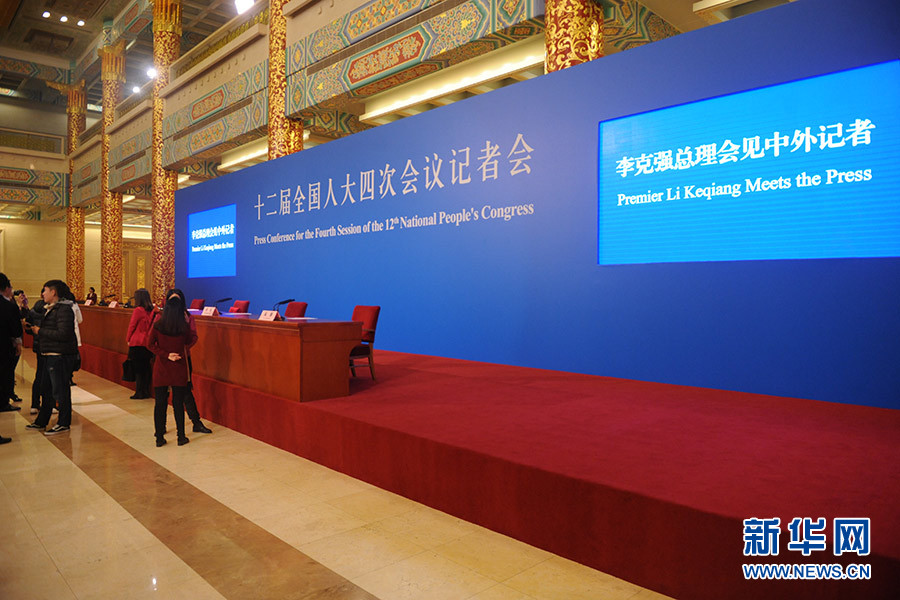 3月16日上午,國務院總理李克強在人民大會堂三樓金色大廳會見采訪十二屆全國人大四次會議的中外記者并回答記者提出的問題。圖為會前現場。 新華網/中國政府網 陳杰攝