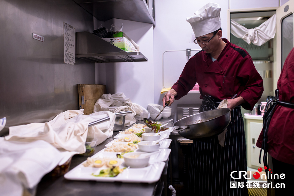 廚師正在加緊烹制旅客點單的菜品。
