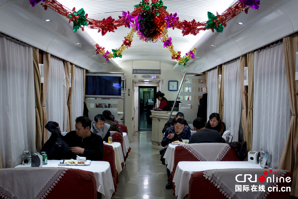 在餐車用餐的旅客。
