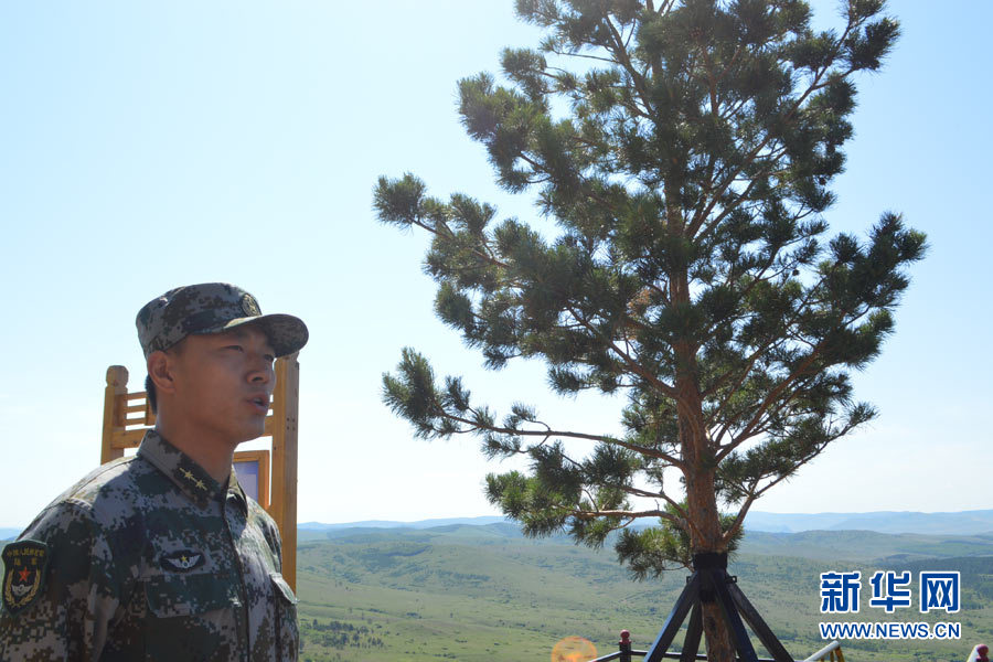 6月24日,三角山哨所,候躍敏排長(zhǎng)在樟子松旁介紹“相思樹(shù)”的故事。新華網(wǎng) 張敏彥 攝