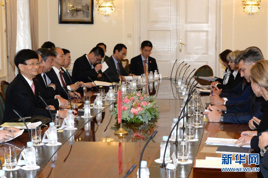 9月12日,克羅地亞總理普連科維奇(右二)在首都薩格勒布會(huì)見(jiàn)到訪(fǎng)的習(xí)近平主席特使、中共中央政治局委員、中央政法委書(shū)記孟建柱(左一)。新華社記者高磊攝