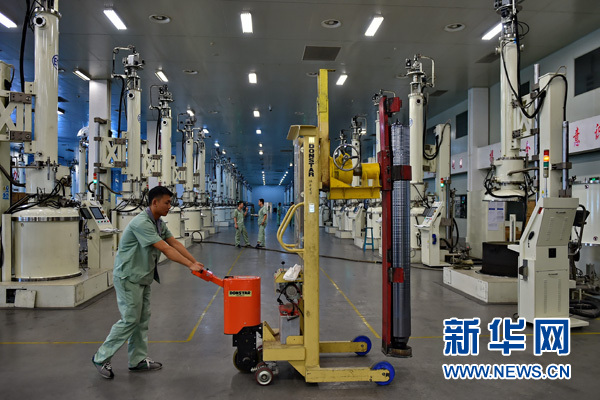 山西潞安集團太陽能科技有限責任公司的工人在搬運剛剛生產(chǎn)出的單晶硅棒(7月20日攝)。新華社記者 曹陽 攝