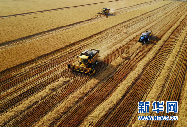 在河南浚縣中鶴現(xiàn)代農(nóng)業(yè)示范園區(qū)的麥田里,收割機在收獲小麥(6月7日攝)。新華社記者 李安 攝