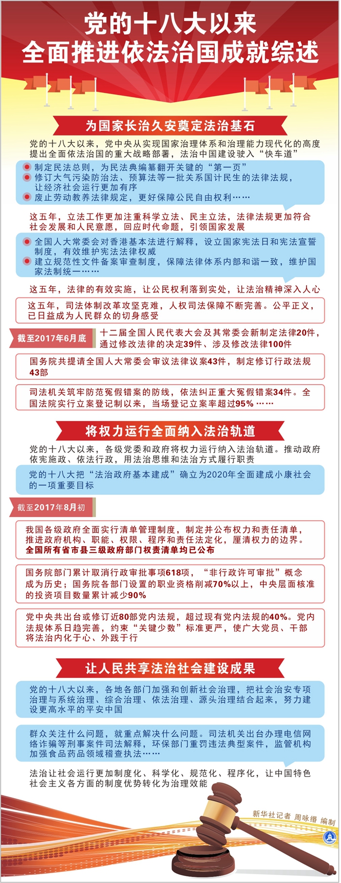 從修改立法法賦予所有設區的市地方立法權,到加強規范性文件違憲違法備案審查;從發布法治政府建設實施綱要,到司法體制改革“猛藥去疴”;從依法懲治腐敗推進全面從嚴治黨,到依法治軍、從嚴治軍……五年來,改革發展穩定、內政外交國防、治黨治國治軍,由法治作保障、靠法治來推進。