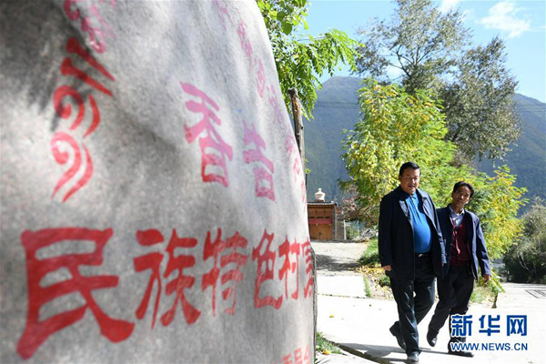 10月12日,甘肅甘南藏族自治州夏河縣曲奧鄉(xiāng)香告村村支書(shū)鬧日加(左)和村民邊走邊談。新華社記者 陳斌 攝