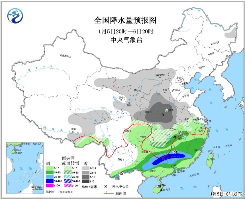 6日白天至8日,江南東部和南部、華南大部有中到大雨,其中湖南東南部、江西南部、福建西部和南部、廣東北部、廣西北部等地的部分地區有暴雨、局地大暴雨(累計雨量80~150毫米)。貴州中北部和湖南西北部局地有凍雨。