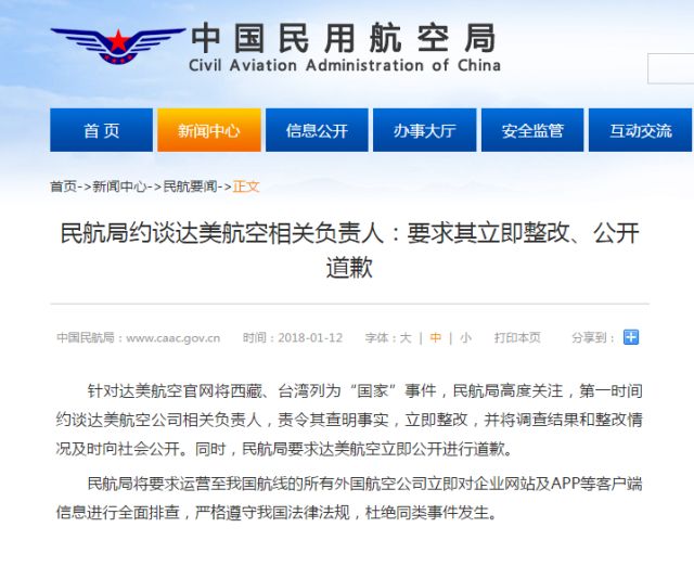 針對達美航空官網(wǎng)將西藏、臺灣列為“國家”事件,民航局高度關(guān)注,第一時間約談達美航空公司相關(guān)負責人,責令其查明事實,立即整改,并將調(diào)查結(jié)果和整改情況及時向社會公開。同時,民航局要求達美航空立即公開進行道歉。