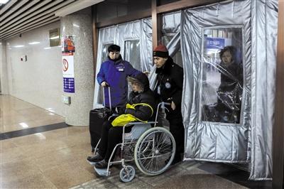 北京西站北一出口外,愛心扶助員用輪椅推著一位身體不適的老人去乘坐公交車。