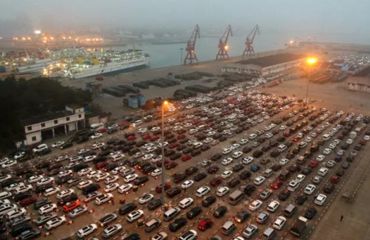 ▲ 2月22日,汽車在海口市秀英港港區內排隊等待出島。新華社記者趙穎全攝