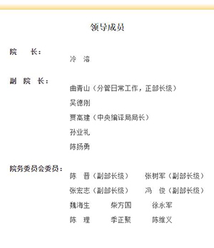此外,擔任副院長的有曲青山(分管日常工作,正部長級)、吳德剛、賈高建(中央編譯局局長)、孫業禮、陳揚勇,院務委員會委員分別有陳晉(副部長級)、張樹軍(副部長級)、張宏志(副部長級)、馮俊(副部長級)、魏海生、柴方國、徐永軍、陳理、季正聚、陳維義。