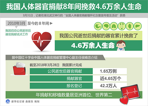 新華社武漢4月1日電(記者馮國棟)記者31日在湖北武漢舉行的“全國人體器官捐獻緬懷紀念暨宣傳普及活動”獲悉,2010年3月我國啟動公民逝世后器官捐獻試點工作至今的8年間,我國公民逝世后捐獻的器官累計挽救了4.6萬余人生命。