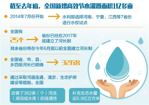 “目前,全國有25個省份已經建立了河長制,其余省份將在今年6月底前全面建立河長制。全國省、市、縣、鄉四級河長已有32萬名。各級河長帶頭巡河履責,開展專項行動,整治突出問題,健全管理機制,取得了明顯成效。”水利部河長辦主任祖雷鳴說,很多河流從“沒人管”到“有人管”、從“多頭管”到“統一管”、從“管不好”到“管得好”,實現了重大轉變。