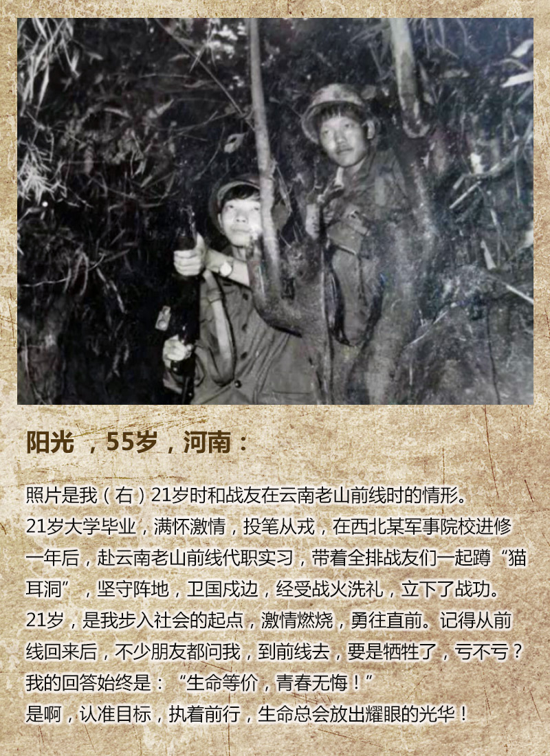 #21歲的我#【電影也拍不出來的芳華!爸媽爺奶輩的21歲原來是這樣的】21歲,你在干什么?問題一發出,不僅有大批年輕人來分享故事,就連他們的爸媽爺奶輩也坐不住了!來看看他們的21歲,綻放過怎樣的芳華?他們的21歲,奉獻青春保家衛國,這是不是讓人熱血沸騰?21歲的故事,我們繼續等你分享!