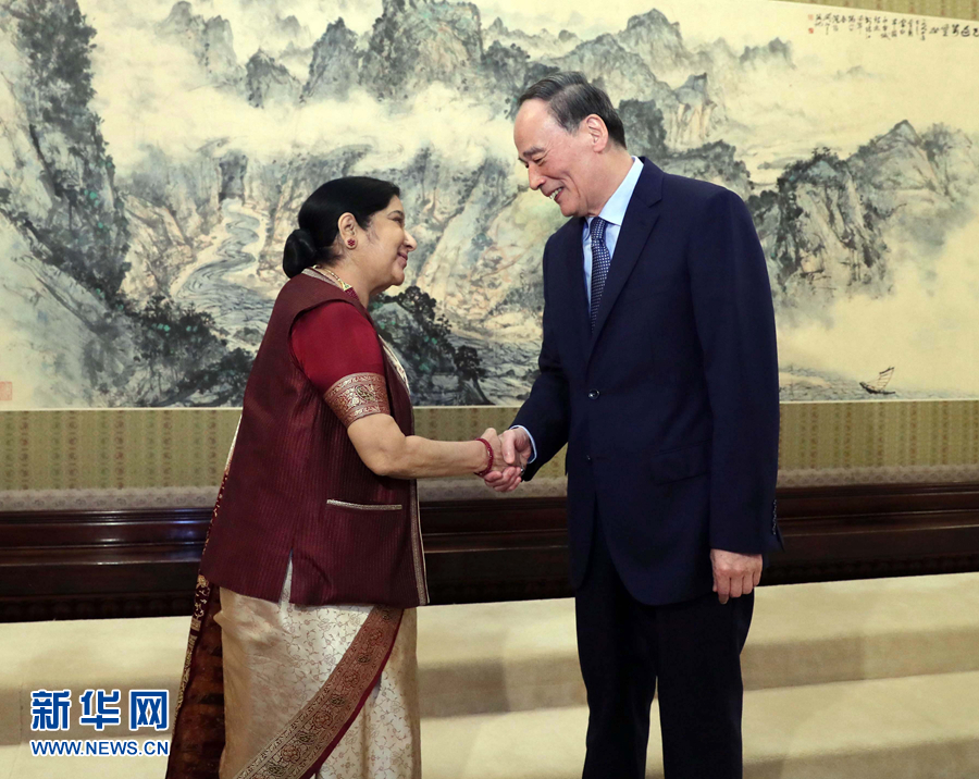 王岐山會(huì)見(jiàn)印度外長(zhǎng)斯瓦拉杰