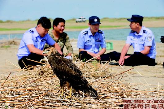 ▲2017年8月15日,達(dá)賚湖公安分局民警救助白腹鷂。新華社記者李云平攝