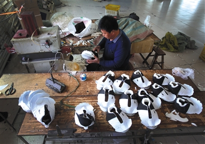 2017年4月28日,河北省安新縣崔公堤村,位于白洋淀以西,村內鞋廠眾多,工人正在加工鞋面。新京報記者 王貴彬 攝
