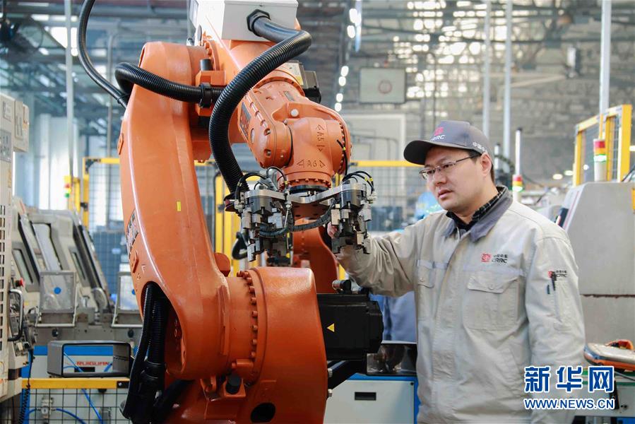 中國中車戚墅堰機車車輛工藝研究所有限公司首席技師劉云清在改進中車戚墅堰所首條機器人渦輪殼生產線的機器人夾具(資料照片)。新華社發