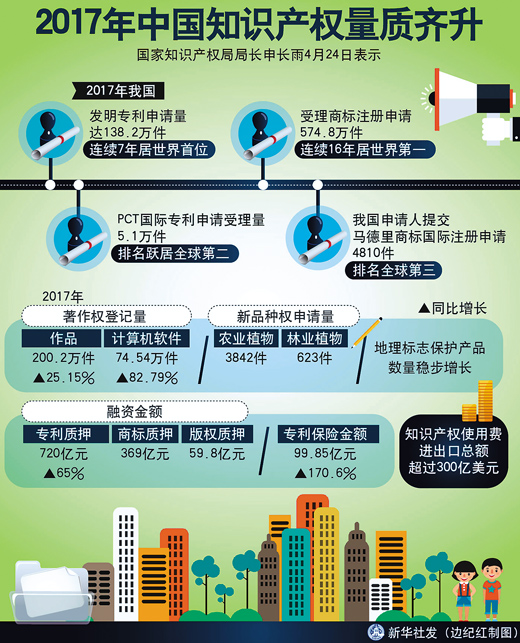 隨著中國經(jīng)濟迅速發(fā)展和創(chuàng)新能力的提高,加強知識產(chǎn)權(quán)保護愈加顯得迫切。對此,不僅外資企業(yè)有要求,中國企業(yè)更有要求。2017年,中國國家知識產(chǎn)權(quán)局共受理發(fā)明專利申請138.2萬件,其中國內(nèi)申請超過90%;商標(biāo)申請量達到574.8萬件,其中國內(nèi)申請量占到96.36%,顯示了國內(nèi)市場主體和創(chuàng)新主體對加強知識產(chǎn)權(quán)保護的強烈需求。