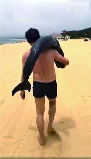 昨天,網絡流傳的多段視頻顯示,一名身穿泳衣的男子疑似背上扛著一只海豚在沙灘行走(見圖)。多位網友回復稱,該事件發生于廣東陽江市海陵島沙灘附近,涉事男子直接把海豚扛走。
