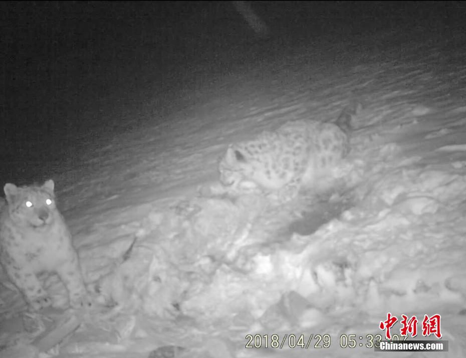 兩只成年雪豹分食一頭獵物。文/趙朗 曾嘉 監(jiān)測畫面