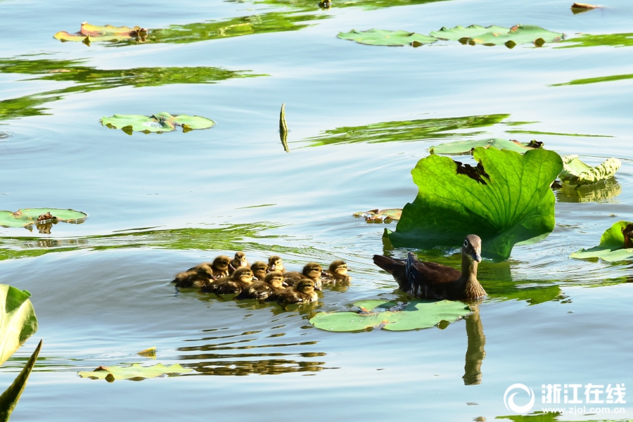 5月15日,西湖斷橋荷塘出現了今年第4窩小鴛鴦,此次共10只。與西湖第1窩時的獨苗相比,此窩可算是一個大家庭, 這讓鴛鴦媽媽忙不過來了。(浙江在線拍友 里爾 攝)