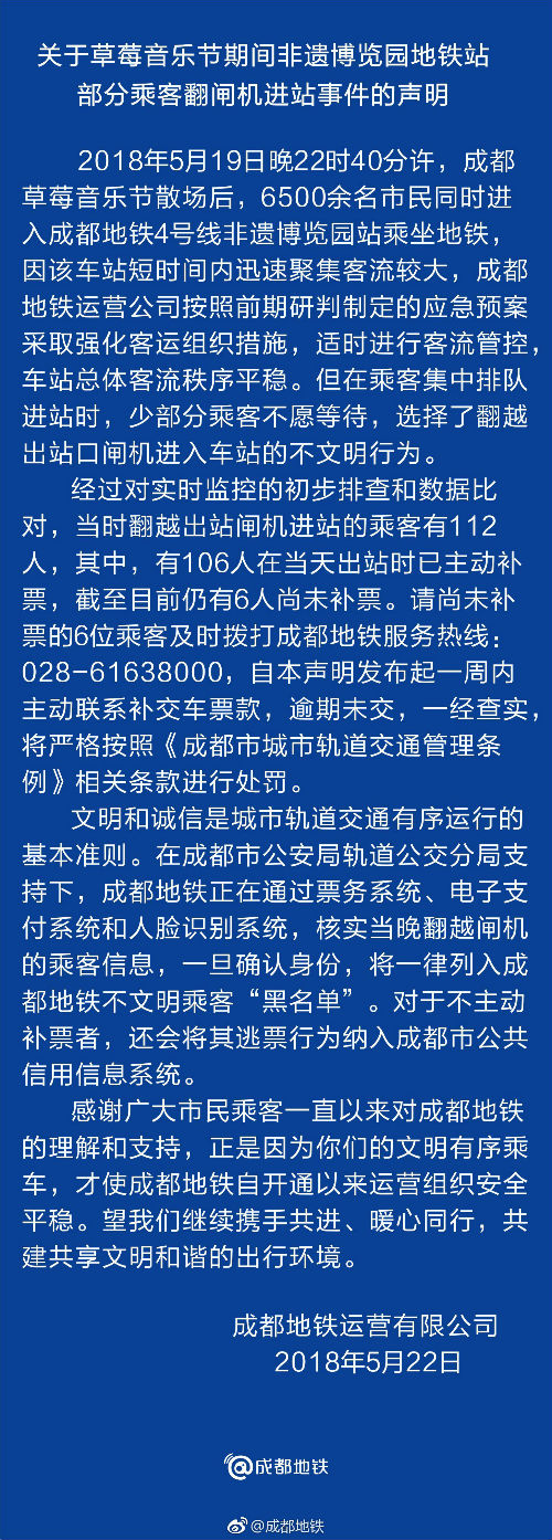 5月22日,成都地鐵發(fā)布“關于草莓音樂節(jié)期間非遺博覽園地鐵站部分乘客翻閘機進站事件的聲明”(以下簡稱“聲明”),稱,5月19日晚草莓音樂節(jié)散場后翻越地鐵4號線非遺博覽園站出站閘機進站的乘客112人中,尚有6人尚未補票。“聲明”發(fā)布起一周內(nèi),希望他們主動聯(lián)系補交車票款,逾期未交,一經(jīng)查實,將嚴格按照《成都市城市軌道交通管理條例》相關條款進行處罰。