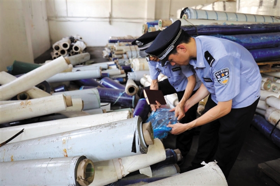 ▲ 黃埔海關緝私局民警查看走私進口的廢塑料薄膜 馬漢青 濮宣 攝