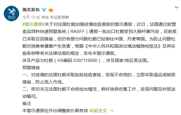 為防止問題牡蠣對消費者健康產生危害,根據《中華人民共和國進出境動植物檢疫法》及其實施條例等有關法律法規的規定,發布本警示通報。涉及產品為牡蠣(HS編碼 0307119000),涉及國家/地區是法國。