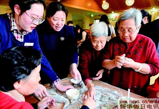 2018年春節(jié),北京西城區(qū)金融街養(yǎng)老照料中心的空巢老人和護理員等一起包餃子。 圖片由受訪者提供